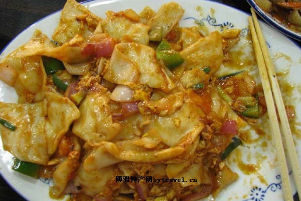 鸡蛋和面,擀成宽面条,煮半熟,炸至金黄色。再加炒仁、肉丝、时鲜蔬菜爆炒后,加高汤煨炒上盘,带高汤同食