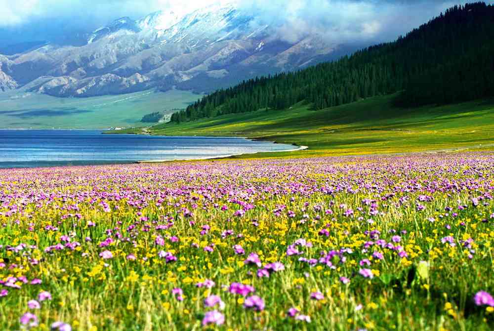 赛里木湖花开(赛里木湖环湖花期,一般从5月上中旬开始,顶冰花、野百合、野郁金香等最早的一批花开、5月中下旬到7月上旬,湖边遍布小黄花,紫色花海、毛莨、金莲花,以及各种不知名的野花)