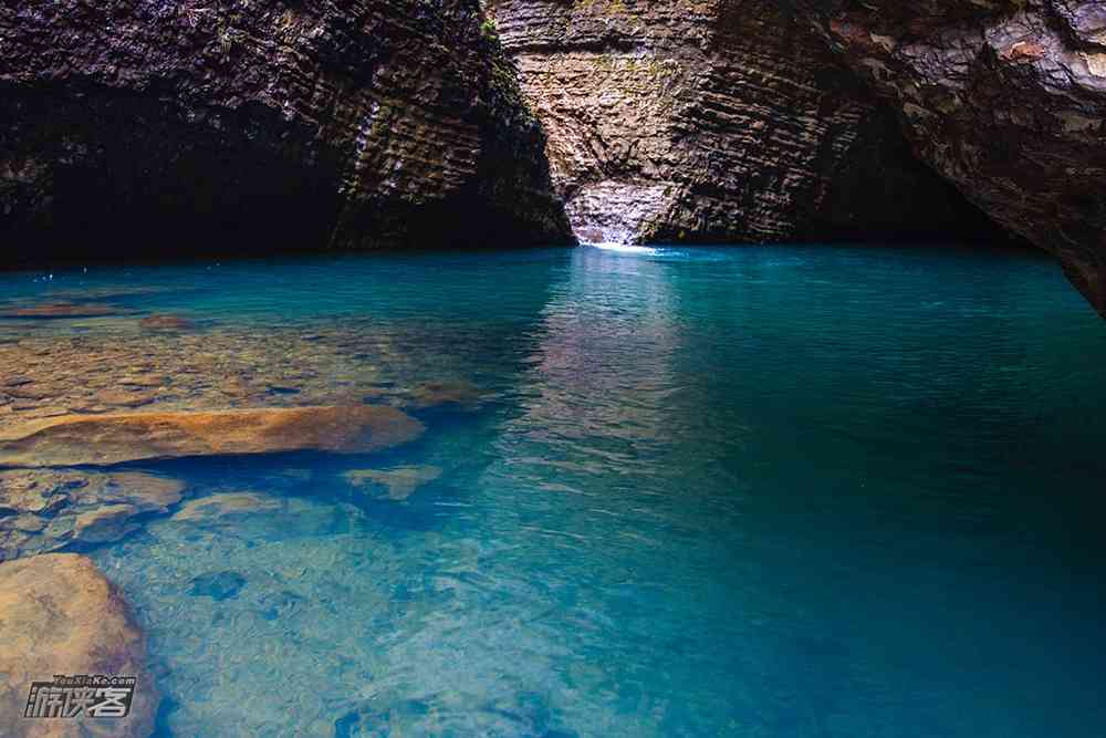 站在村民搭建的小桥上,可以看到一股小溪从上游乱石中奔涌而出,两岸植被茂密,潭水却平静如镜,深不见底。潭边奇石像鳄鱼瞪圆着眼睛将嘴伸向潭里,因此也被称为“鳄鱼潭”。