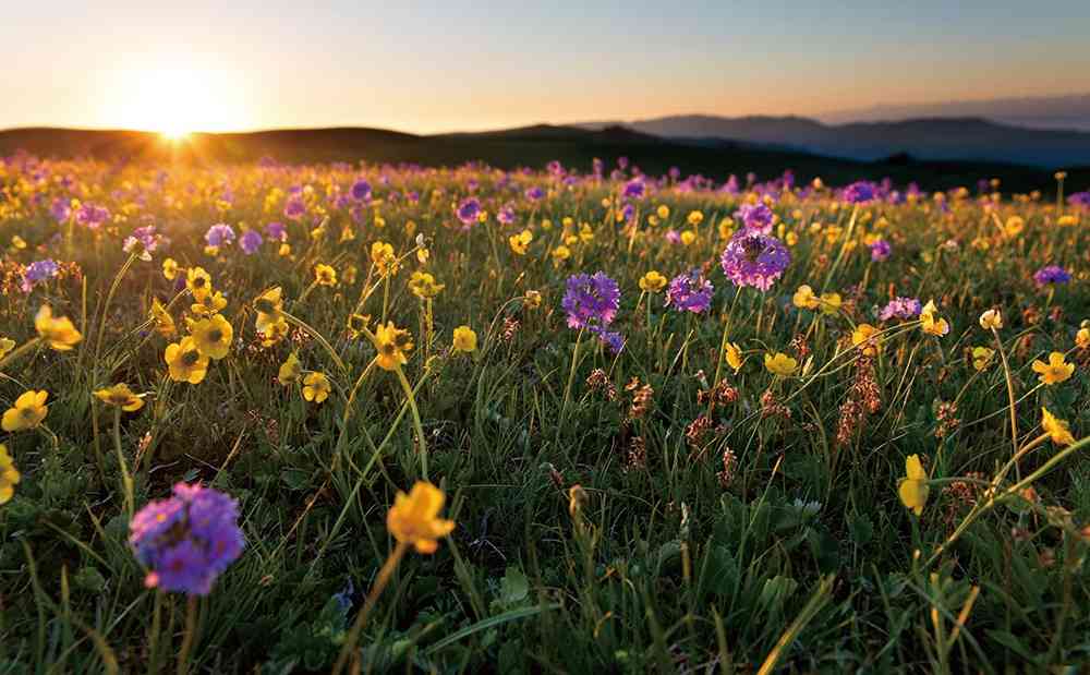 六月,伊犁河谷呈现出最浓的春景。百花仿佛约好了时间,一场夜雨和暖风后,淡蓝的勿忘草、粉红的天山缬草、青蓝的白头翁、银白的火绒草、紫色的新疆花琴、橙色的橙舌飞蓬⋯⋯各色野花在草原上竞相绽放。它们热烈地交织在一起,无边无际地向人们的视野极尽铺展。这个时节青绿底色的草原,变成了一席巨大的厚厚的花毯。
