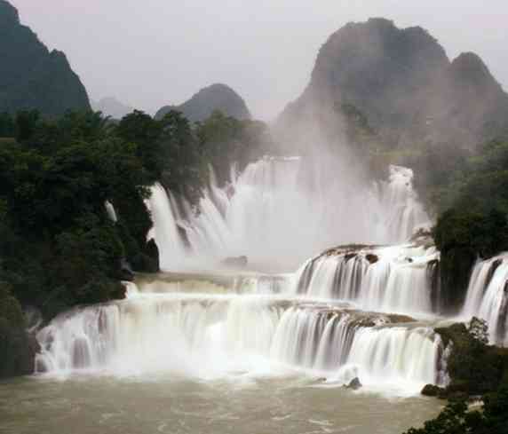 德天瀑布与越南的板约瀑布连为一体,就像一对亲密的姐妹,袅袅婷婷,携手而立。目光穿透那飘渺的水雾,恍见伊人,在水一方,腰缠春江如玉带,垂首秀发落巢湖,身倚峥嵘奇峰怪石,背靠满山梯田古木,巧笑盼兮,眉目传情。