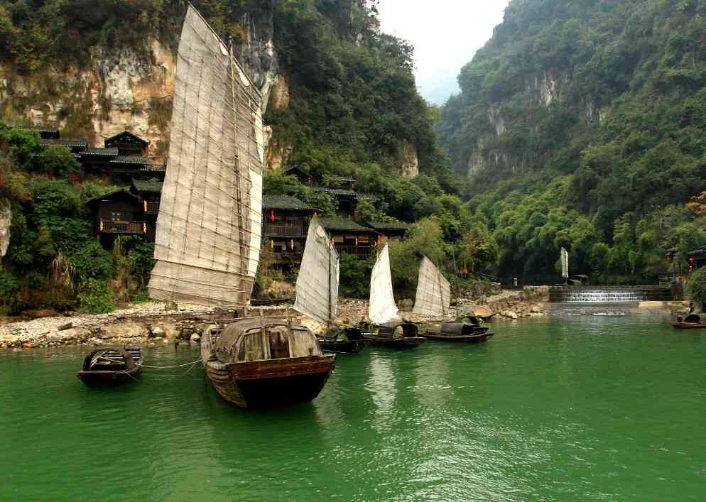 三峡人家,依山傍水,风情如画:传统的三峡吊脚楼点缀于山水之间,久违的古帆船、乌篷船安静地泊在三峡人家门前,溪边少女挥着棒槌在清洗衣服,江面上悠然的渔家在撒网打鱼……千百年来流传不衰的各种习俗风情体现着峡江人民的质朴好客。
