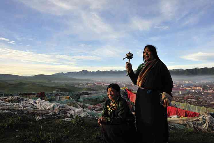 一年一度的佛事活动,都是在正月里举行,在甘南州藏族居住区最著名的是正月十三的晒大佛,当天就有夏河、合作、郎木寺和一些寺院举行晒佛仪式。而绿曲县的郎木寺镇晒佛活动最有人气,因为,这里拥有独特的地理环境和优势资源,虽然一条河划出四川、甘肃两省交界的地方,但是,河对岸的格尔底寺和河北岸的郎木寺,都有大型的展佛、晒佛仪式,郎木寺的地形地貌占有优势,在这里可以一览郎木寺、格尔底寺全景风光。那些时隐时现的墨绿色林海和雪山重叠在一起,形成美丽的藏族村寨,就象看到一幅水墨画,这里是佛教圣地,多少年来一直被称为是摄影师的天堂。