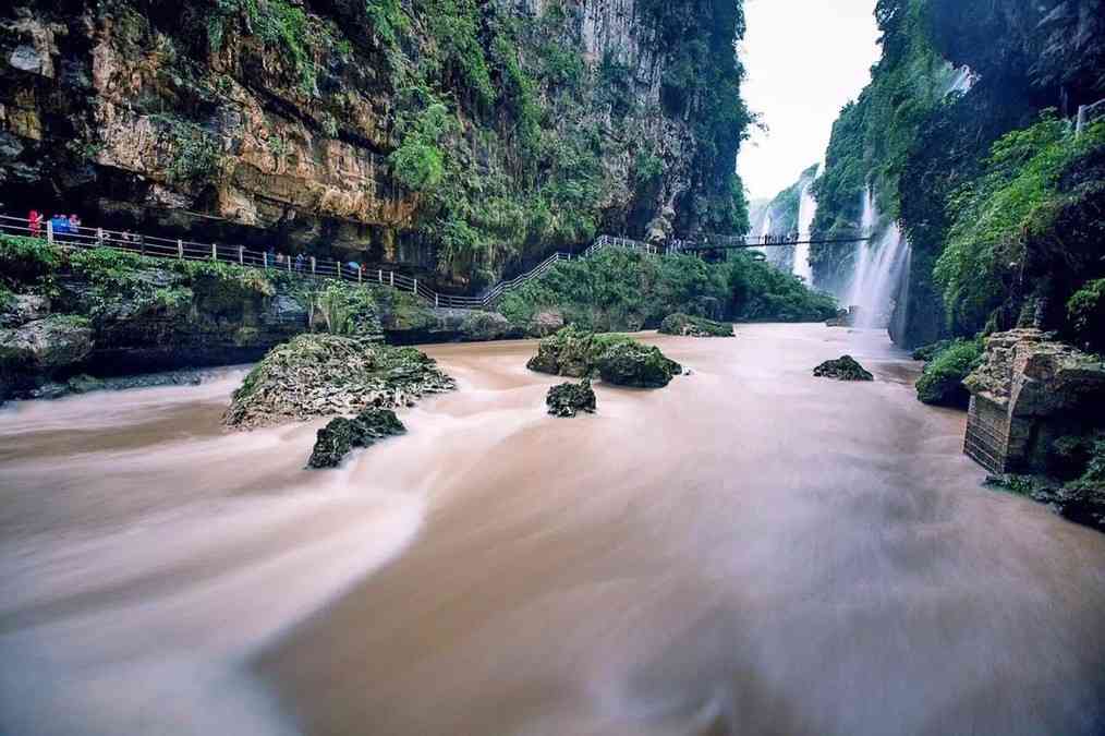 喀斯特地貌的特征,使得峡谷两壁孕育出规模宏大,气势壮观的钙化岩,构成了特有的岩石瀑布。沿着景区的栈道攀崖而行,曲曲折折,如进画中一般,巨大的水流分成数股飞泻直下,水花四溅,在阳光下,色彩缤纷。