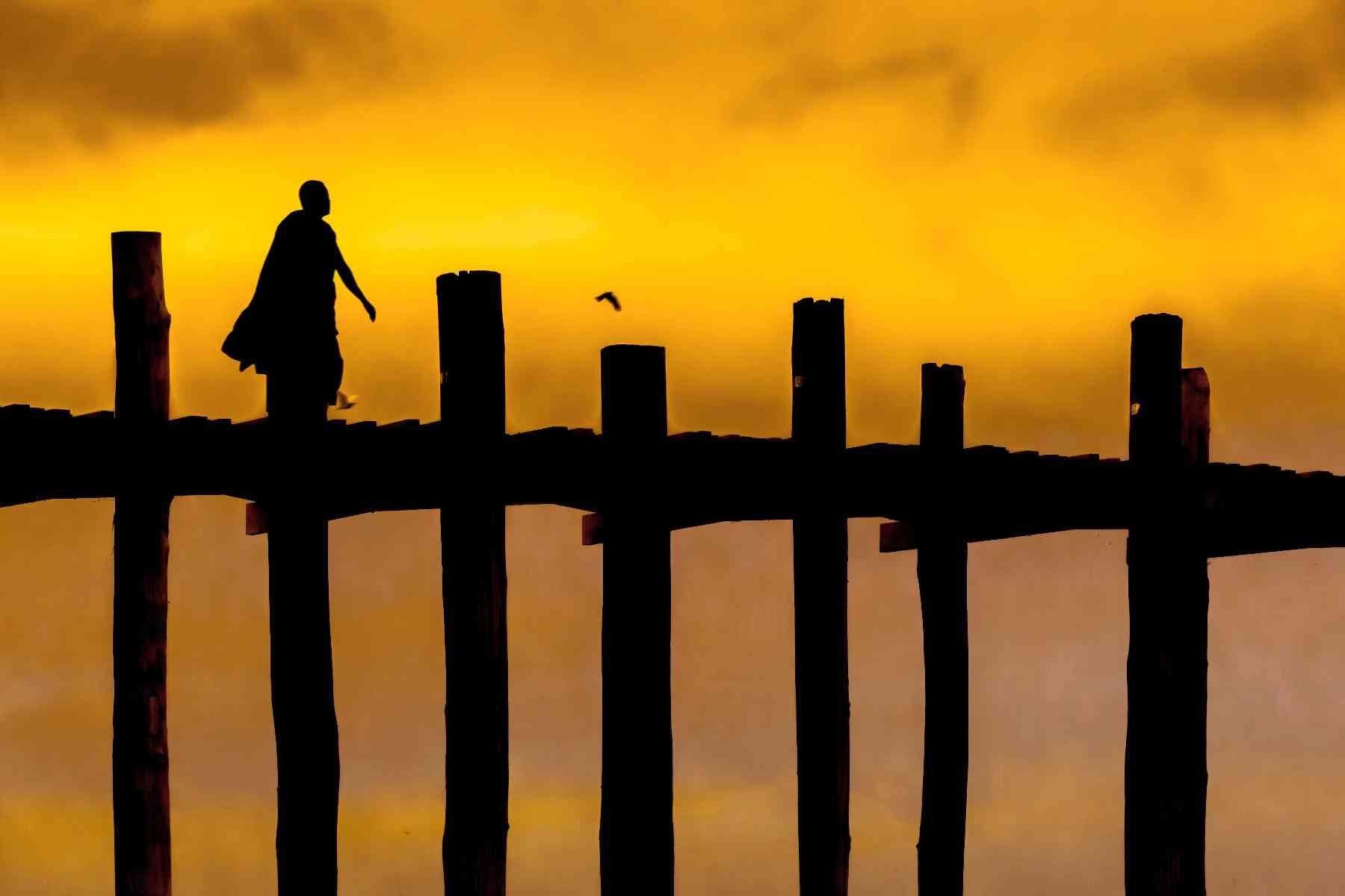 乌本桥的落日很美,美得平和温暖,不带一点点哀伤或是落寞。站在乌本桥上看落日,有回到诗词画中的丝丝感受,远处天空中残阳如火,从水面直烧到天际,给四周全部涂上一层金红。此时会觉得远处的枯树与小船,如同漂浮于画中。偶尔还会听到吉他弹出的熟悉旋律和相伴的缅语歌声。走在乌本桥的夕阳中,觉得一树、一舟、一屋、一人,皆成美景,更有一种人在画中走的感觉。乌本桥一个非常重要的特色就是黄昏光晕迷离下来来去去的僧人,他们数人成群地或游走在乌本桥上,或坐在桥墩上,默默看着夕阳。