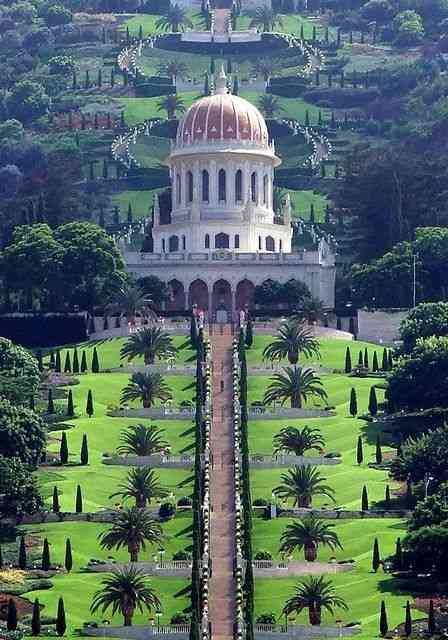 位于以色列海法市的卡梅尔山上。这里是巴哈伊教先知巴孛的安息之地,是巴哈伊教第二圣地。整座花园依山而建,自山脚至山顶长达1公里,垂直高度约225米,最大坡度约63度。对称齐整是极具波斯风情的巴哈伊花园的最大特色花园的中轴线是一条白色大理石砌成的阶梯,树木、水池、花盆、雕塑等景观则对称地分布在两侧。2008年被列入联合国世界文化遗产。