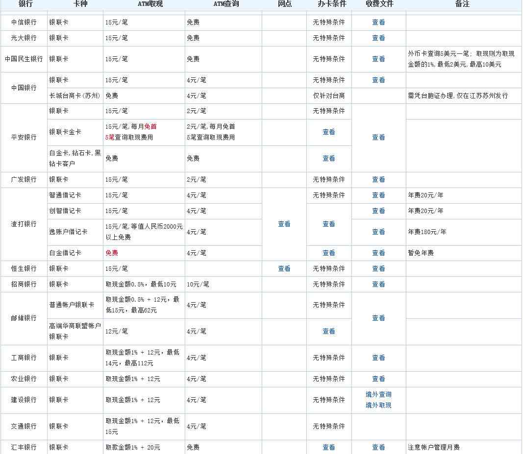 取款限额与收费: